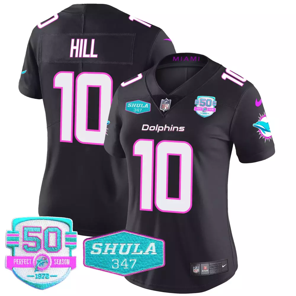 tyreek hill black womens miami dolphins 50th 1972 perfect season patch vapor jersey all stitched;tyreek hill black womens miami dolphins gold trim vapor limited jersey all stitched;tyreek hill black womens miami dolphins miami vice vapor limited jersey all stitched;tyreek hill black womens miami dolphins miami vice vapor limited jersey v2 all stitched;tyreek hill black womens miami dolphins miami vice vapor limited jersey v3 all stitched